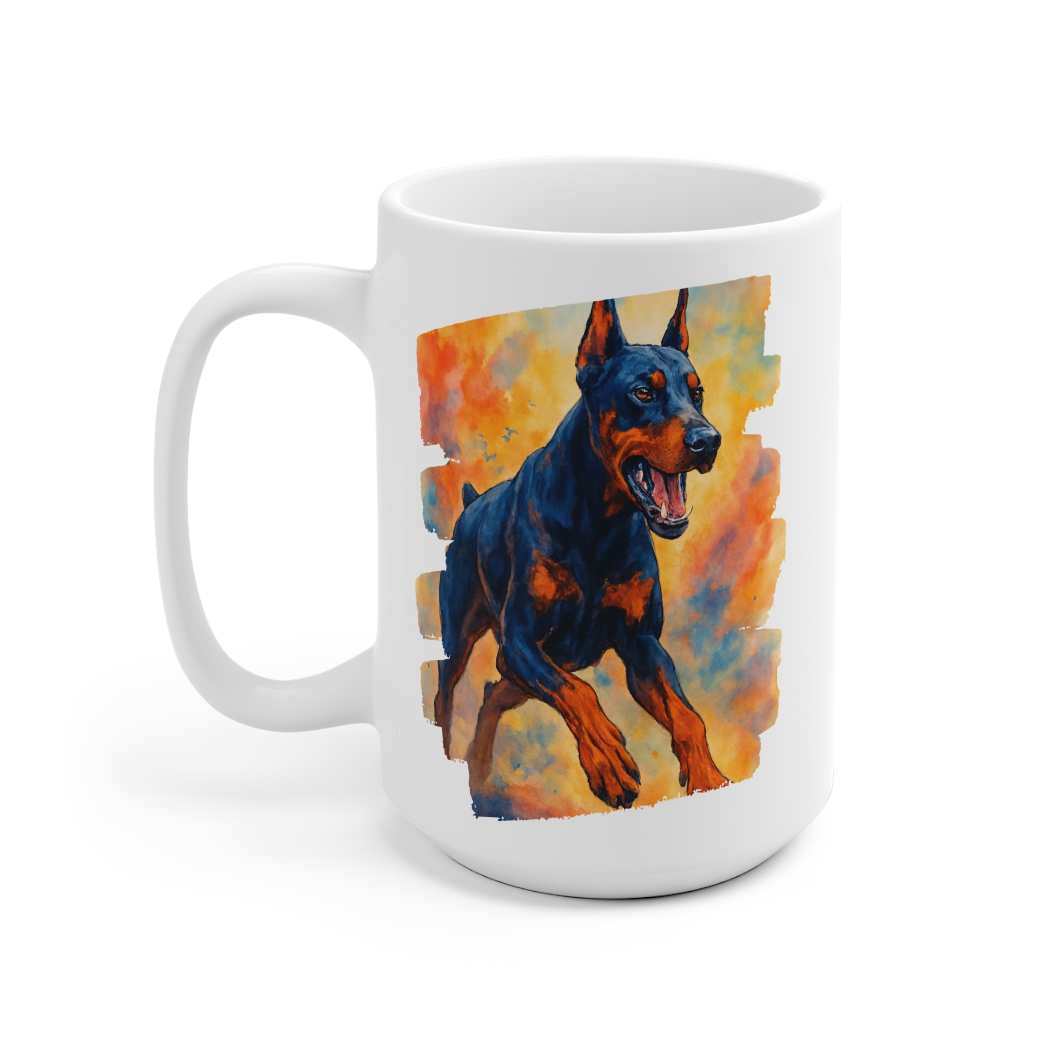 A bold, brave Doberman charges across the surface in a loose, watercolor wash — tense muscles caught mid-stride, ears alert, tail a line of intent. This white ceramic mug brings that fierce, protective energy into slow mornings and late-night brews.